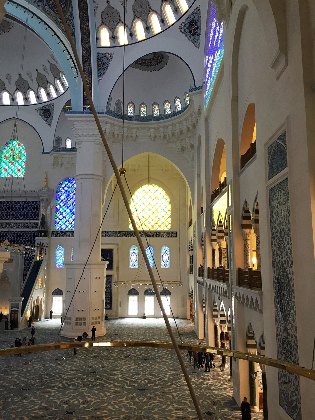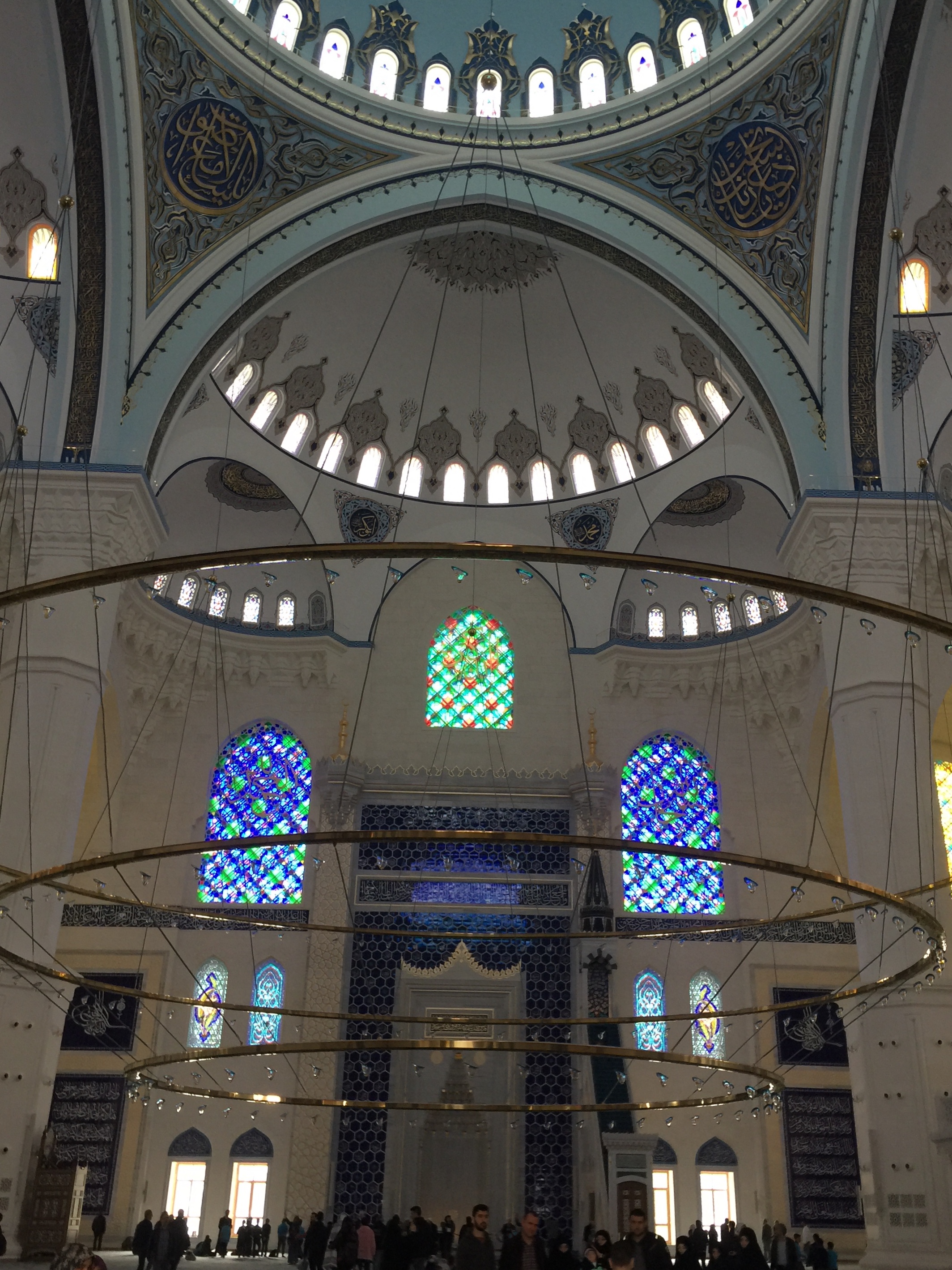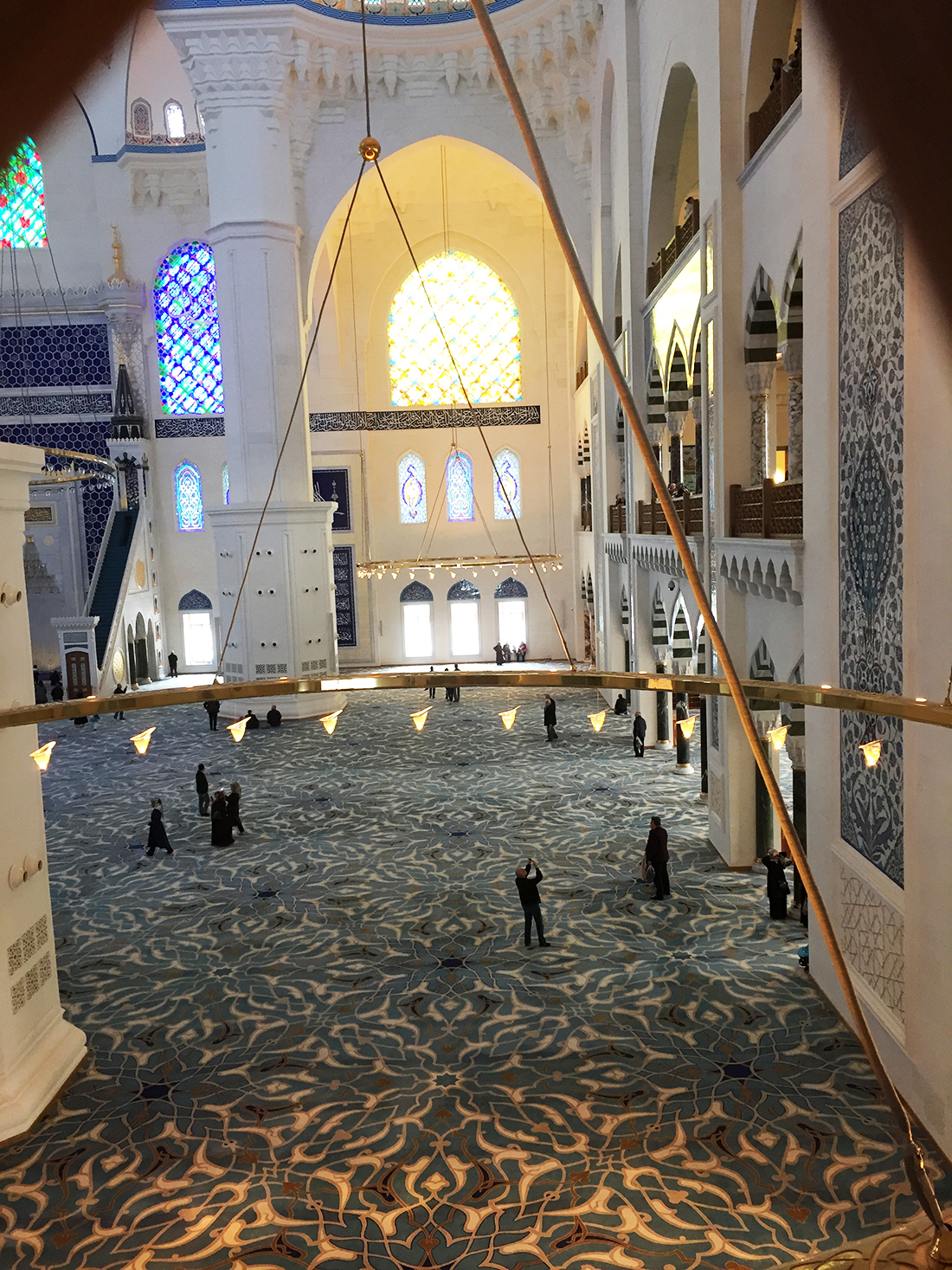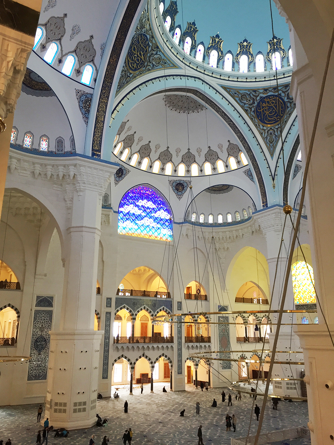 Camii bana abartıldığı gibi büyük gelmedi. İçi güzel, ihtişamlı ama asla abartılı değil. Sade, günümüz ve Osmanlı mimarisine uygun tarzda yapılmış. Büyük bir otoparkı var, abdest alma yerleri temiz ve ferah. Asansörler ve yürüyen merdivenlerle hem yaşlı hem de çocuk dostu bir mekan olmuş 🙂 Biz ikizlerle gittiğimizden o kocaman alanda koşturmak çok hoşlarına gitti 🙂