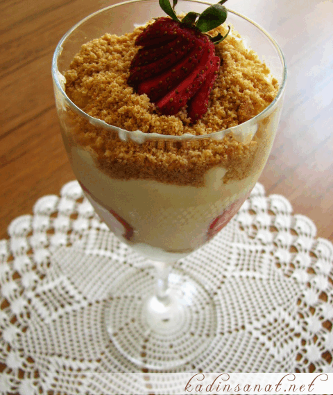 – En üste yine bisküvi kırıntıları ve istenirse çilek koyuyoruz.