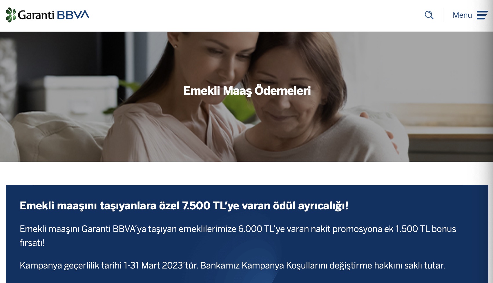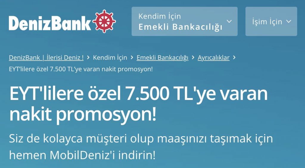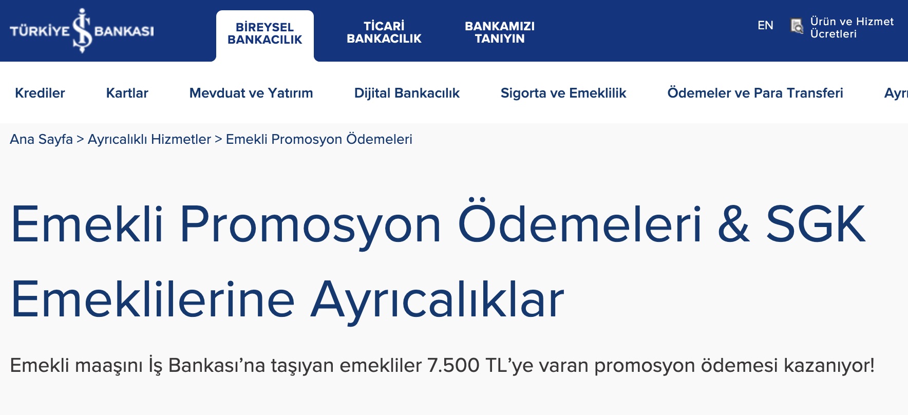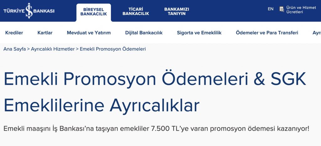 • 10000 TL ve üzeri olan emekli maaş hesaplarına 7500 TL nakit promosyon veriliyor.