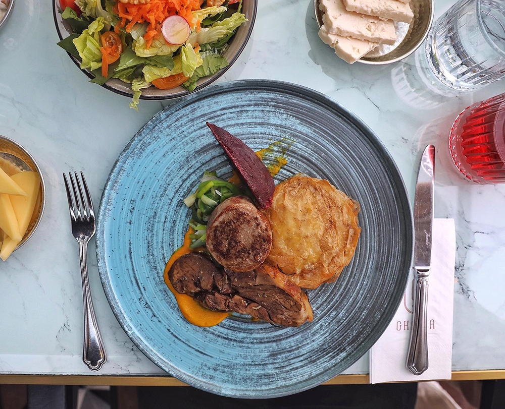 Ana Yemek: Sultan Sarma Bonfile ve Ağır Ateşte Pişmiş Sut Kuzu Tandır (Limonlu havuç püresi, Fırınlanmış pancar, Baklava yufkasında perde pilavı ve Taze soğan kavurma ile)