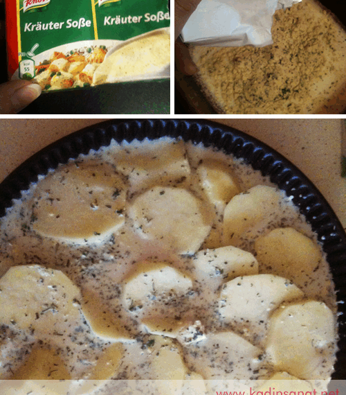 Geçen günlerde Arzu elinde Knorr’un daha önce hiç görmediğim bir sosu ile geldi. Toz halinde olan bu sos ile harika fırın patates yapıldığından bahsetti. Ona da bu sos Almanya’dan gelmişti. Başta kokusu ekşi maya gibi olan tozu sütle karıştırdık. İçinde tahmin edemediğimiz otlar vardı. Sütle karışınca kokusu da daha bir güzelleşti. Biraz tereyağla yağladığımız tart kalıbına yuvarlak olarak kestiğimiz patatesleri yerleştirdik. Üzerine de karışımı döktük. Fırına sürdük. Eğer üzerine kaşar koysaydık daha güzel olurdu diye  düşündüm. Ama bu hali bile çok güzeldi. Hemen yediğimiz için son halinin fotoğrafını çekemedik tabi 🙂