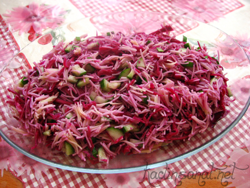 – Soğuyan şehriyeleri mor lahana ile birleştirip minik küpler halinde doğranan salatalıkları ekleyin