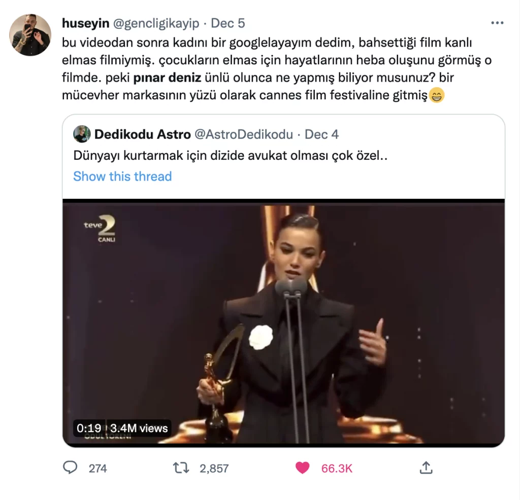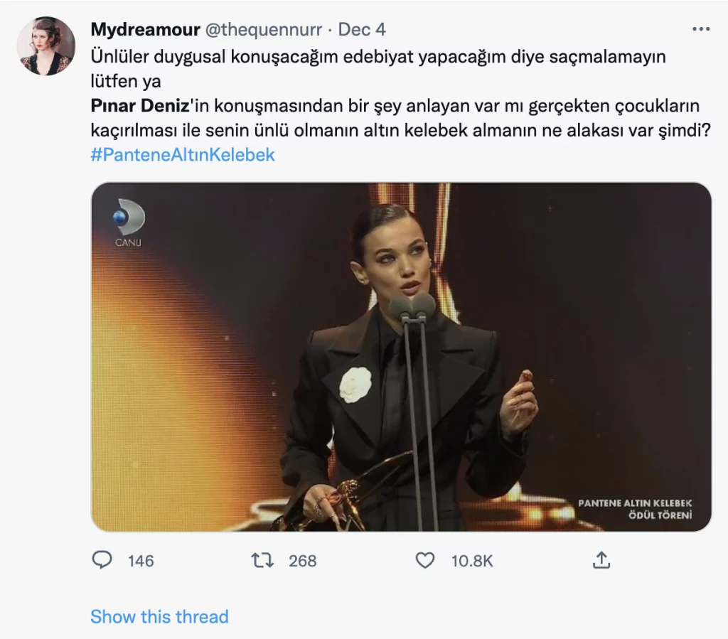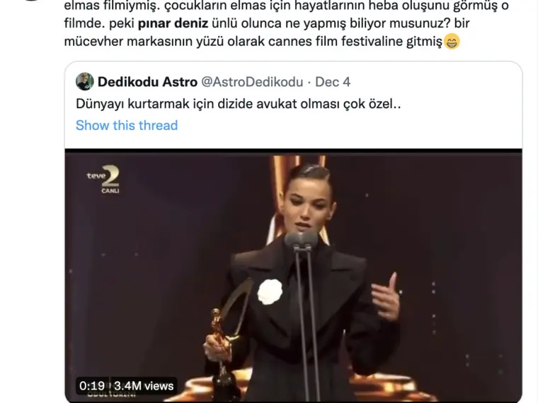 Altın Kelebek ödül törenini geride bıraktık. Kazananları paylaştıktan sonra Pınar Deniz konuşması ile sosyal medyada konuşulur oldu. Biz hemcinsimiz olan Pınar’ın konuşmasında bir gariplik göremedik. Her zamanki gibi sosyal medyanın abartılı tavrı diye düşünüyoruz.