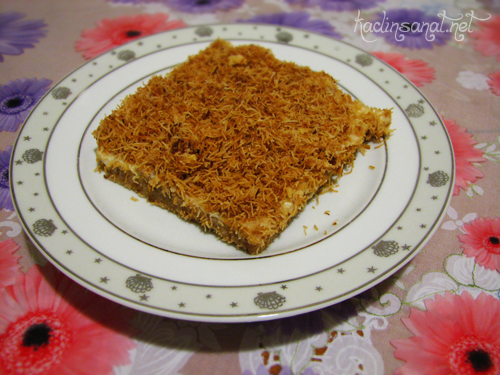 – Tepsiye 1 kat kadayıf yayın, üzerine muhallebiyi dökün
