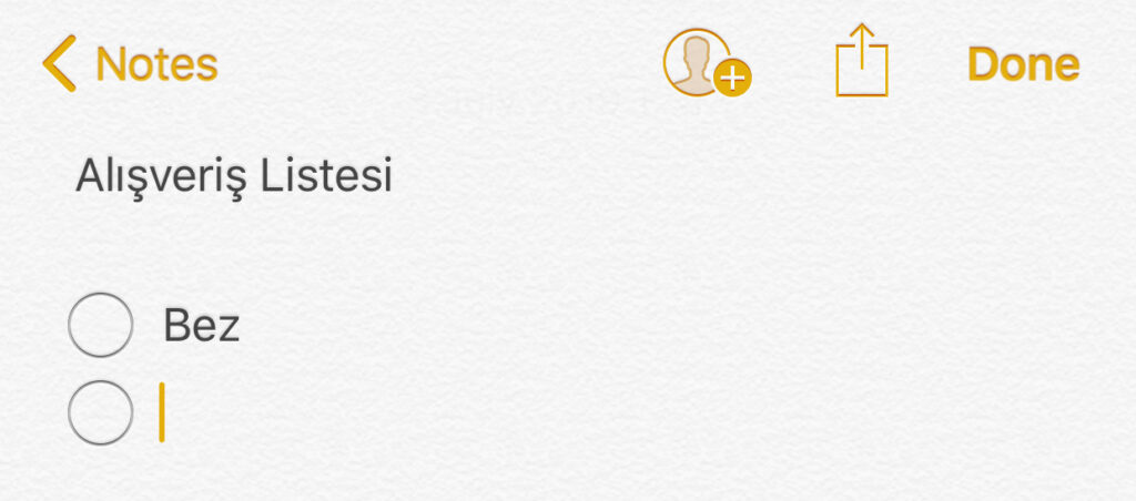 Aslında alışveriş listesi için pek çok uygulama var ancak eşimin tavsiyesi üzerine Notlar uygulamasını kullanmak bizim için çok kolay oldu. Çünkü ikimiz de iPhone kullanıyoruz ve bu sayede Notlar uygulamasında bir sayfa oluşturup birbirimizle paylaştığımızda (nasıl yapıldığını aşağıda anlatıyorum) ikimiz de aynı sayfayı görebiliyor ve güncelleyebiliyoruz. Böylece istediğim zaman kendi telefonumda Notlar’ı açıp alışveriş listesini güncellediğimde eşim de kendi telefonundan bu listenin son haline ulaşabiliyor ve madde madde yazdığım için alışveriş yaparken oradan aldıklarını işaretleyebiliyor. İstediğinde kendi de listeye ekleme yapabiliyor.