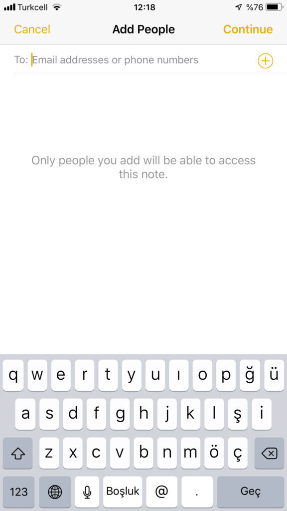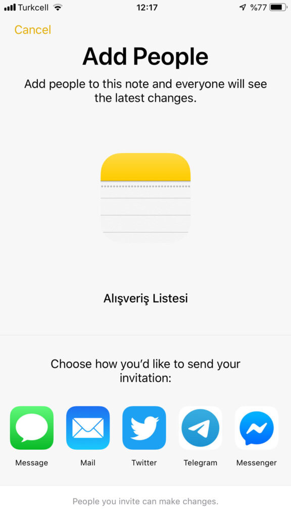 Sonraki ekranda telefonunuzda kurulu uygulamalara göre iMessage, Twitter, Mail, Telegram, WhatsApp gibi bir kaç iletişim yöntemi gösterip bunlardan birini seçerek paylaşın diyor ama iMessage ve Mail’i seçerseniz not dosyanızı içine koyup muhatabınıza gönderiyor. Diğerlerini seçtiğinizde size bir arama ekranı çıkartıp paylaşım yapacağınız kişinin iCloud email adresini yazmanızı istiyor. İki yöntemle de sonuçta muhatabınıza bir şekilde iletiliyor ve onayladığında artık ikinizde dosyayı görüp güncelleyebiliyorsunuz. Hatta isterseniz başkalarını da bu paylaşıma katabilirsiniz. İki kişi diye bir sınır yok.